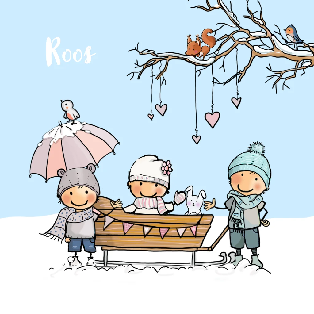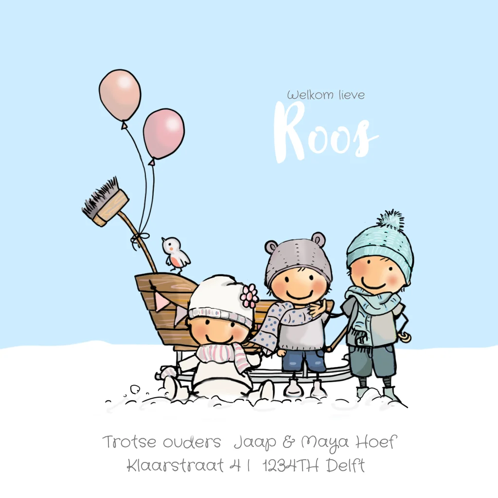 Mooi handgetekend geboortekaartje voor 3e kindje baby meisje en twee stoere broertjes in houten sleekar met winterlandschap. Winters geboortekaartje baby op slee in witte sneeuw. (5835)