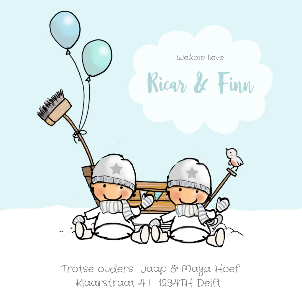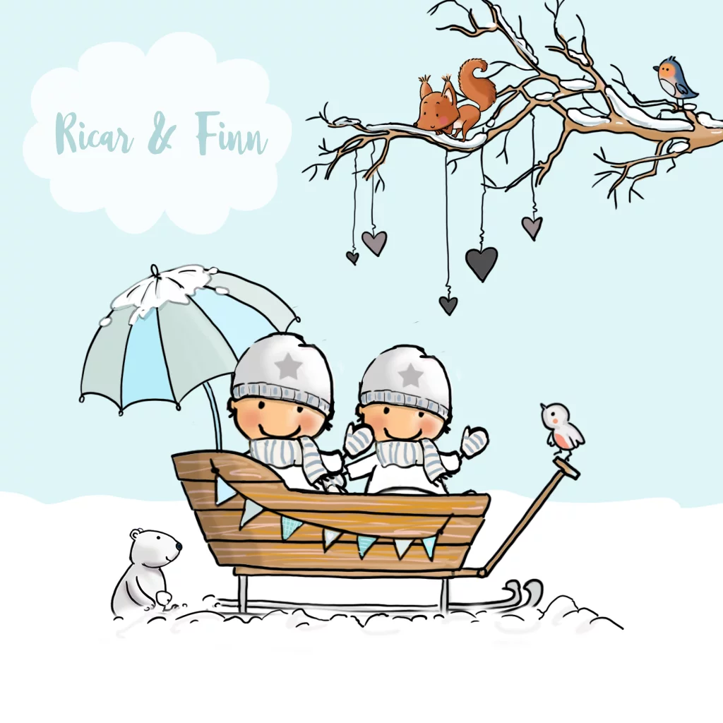 Mooi handgetekend geboortekaartje voor een jongetjes tweeling in houten sleekar met winterlandschap. Winters geboortekaartje baby op slee in witte sneeuw. (5827)