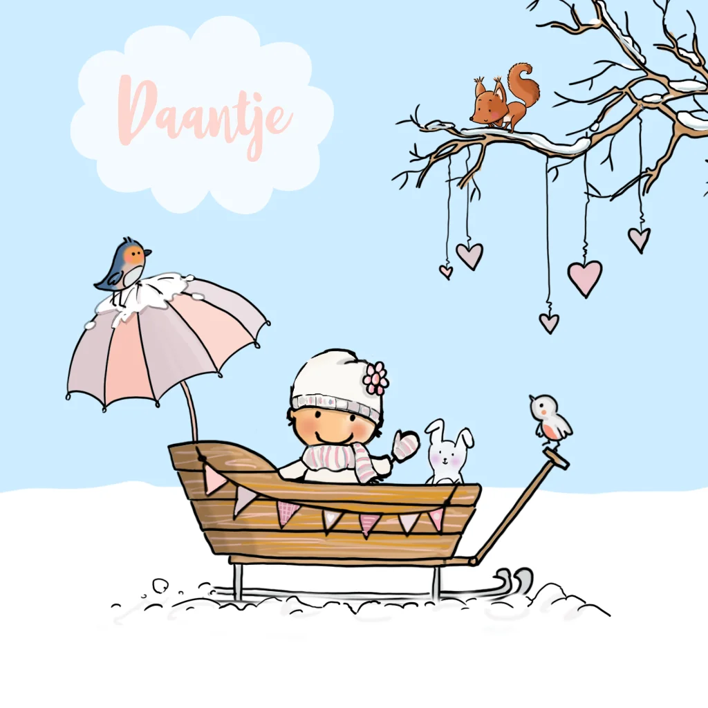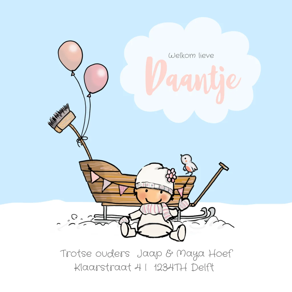 Leuk met de hand getekend geboortekaartje voor een meisje in houten slee met winterlandschap. Winters geboortekaartje baby op slee in witte sneeuw. (5828)