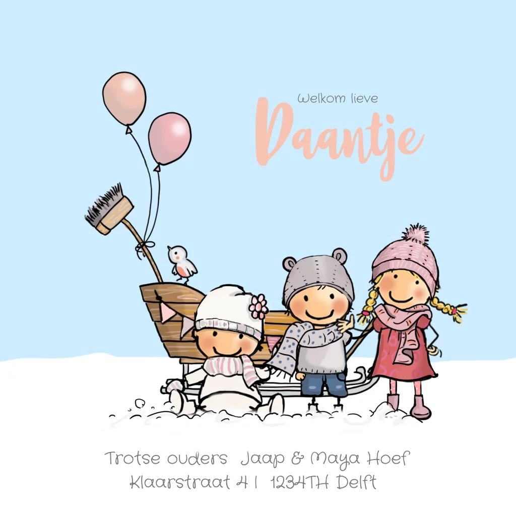 Mooi 3e kindje geboortekaartje voor een baby meisje, broertje en grote zus in houten slee met winterlandschap. Winters geboortekaartje baby op slee in witte sneeuw. (5834)