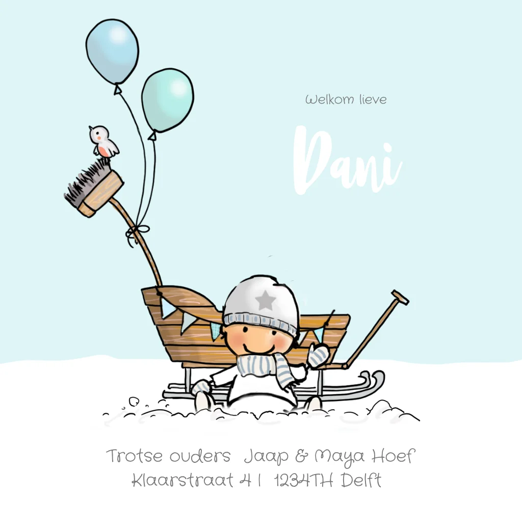 Leuk 3de kindje geboortekaartje voor een broertje met grote zus in houten slee met winterlandschap. Winters geboortekaartje baby op slee in witte sneeuw. (5840)