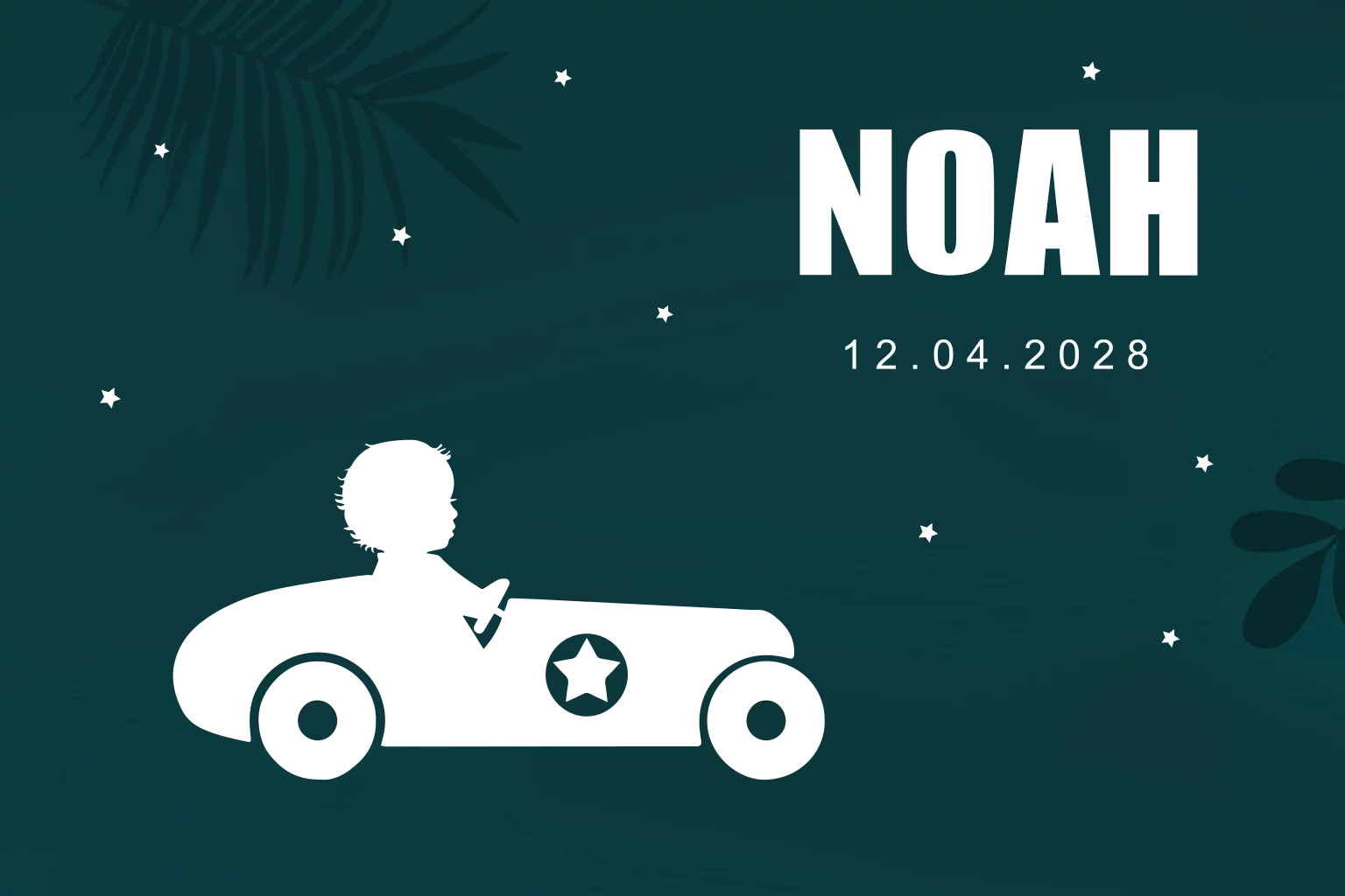 Enkele liggende geboortekaartje jongen met raceauto en foliedruk