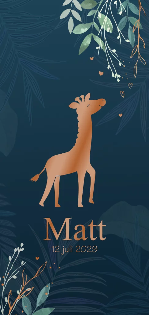Geboortekaartje giraf met echt koper hoogglans lak jongen