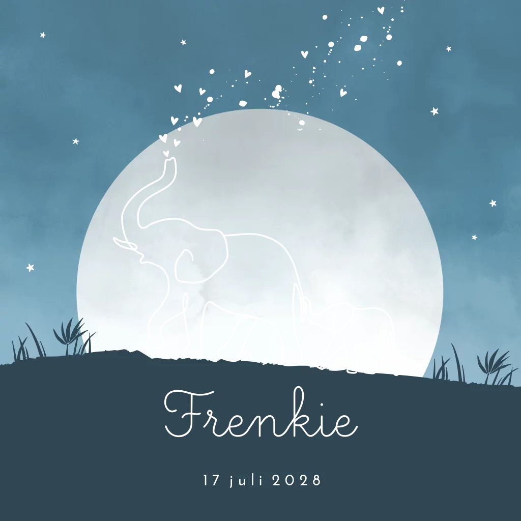 Geboortekaartje jongen met goudfolie olifantjes met de maan op de achtergrond donkerblauw Frenkie (21364) Dit kan gebruikt worden voor een 2e kindje door de 2 olifantjes die samen de wereld gaan ontdekken