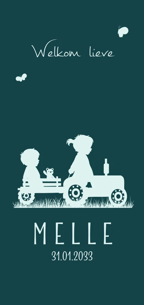 Geboortekaartje met tractor, zus, broer en teddybeer