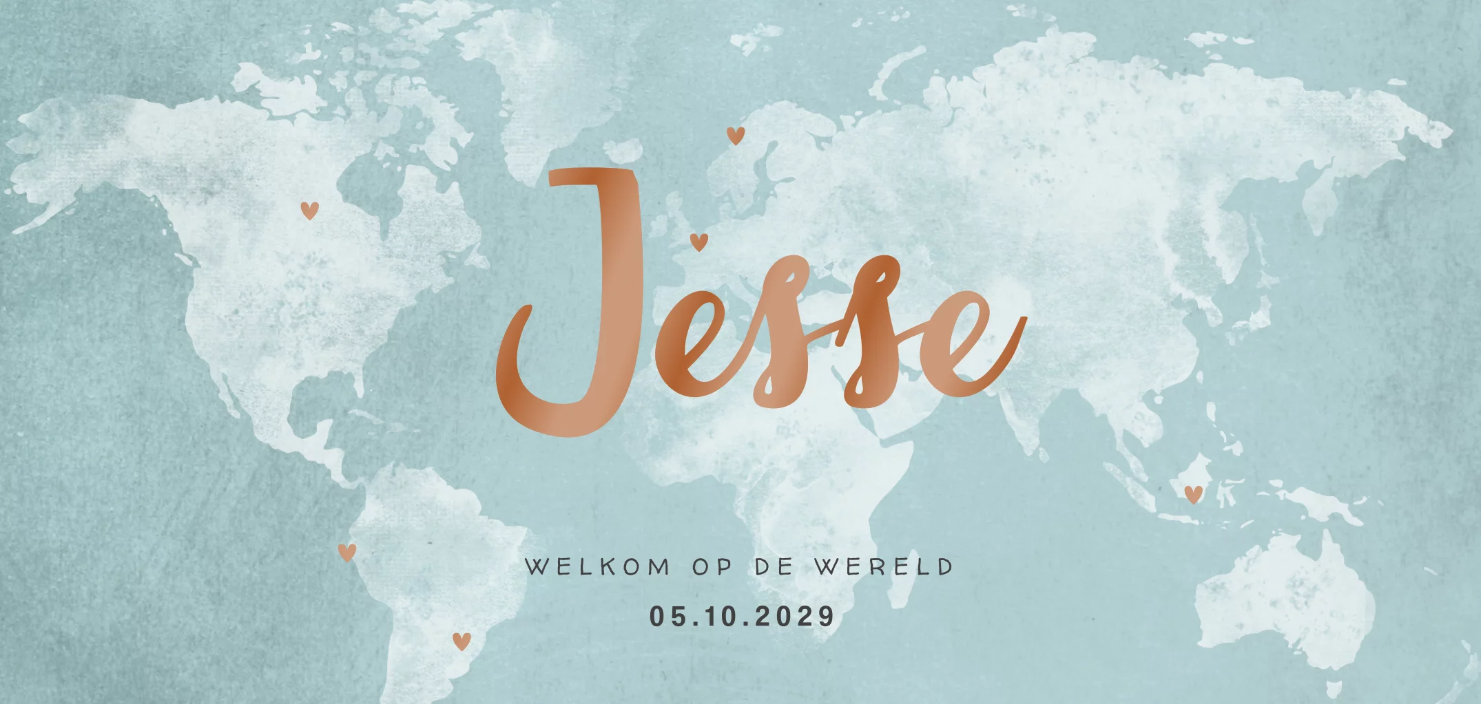 Stoer geboortekaartje voor een jongen met grote wereldkaart licht blauw met hoogglans koper lak. (21299). Leuk voor een kindje wat de wereld mag gaan ontdekken, maar ook te gebruiken als adoptie geboortekaartje door een hartje op de geboorteplaats te zetten.