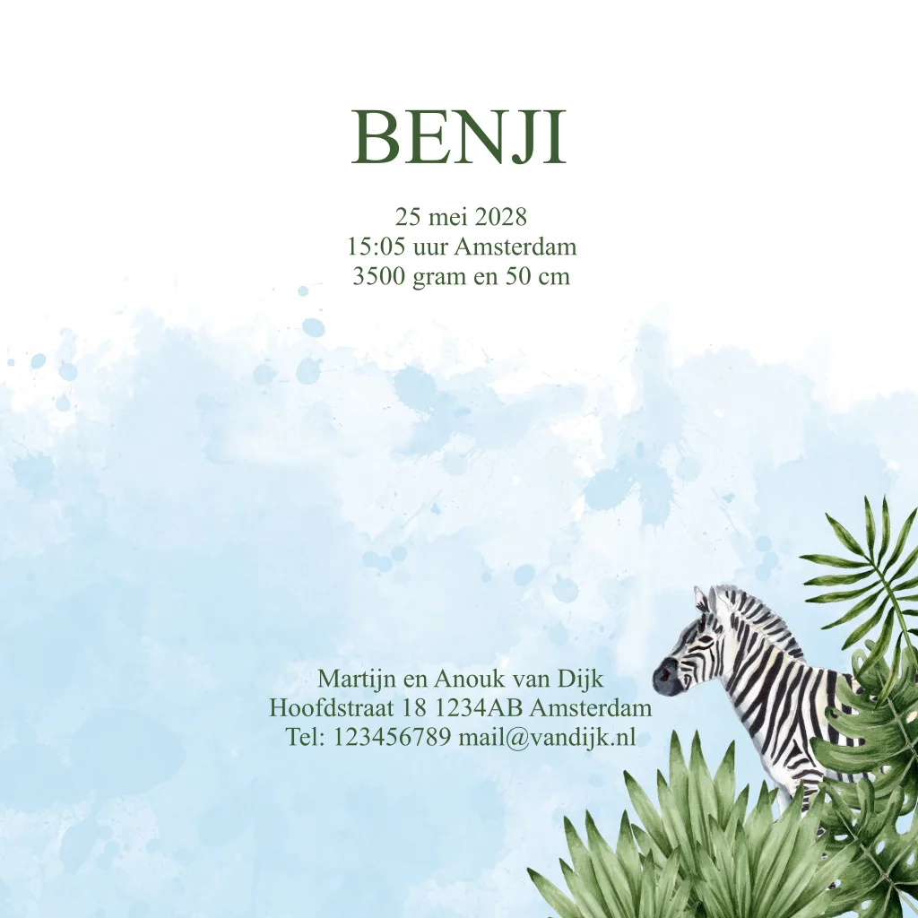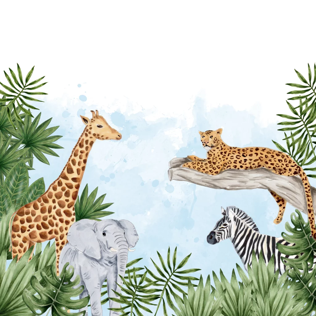 Een hip geboortekaartje voor een jongen, met jungle illustratie, dieren en goudfolie. Pas zelf de teksten aan. (21436)