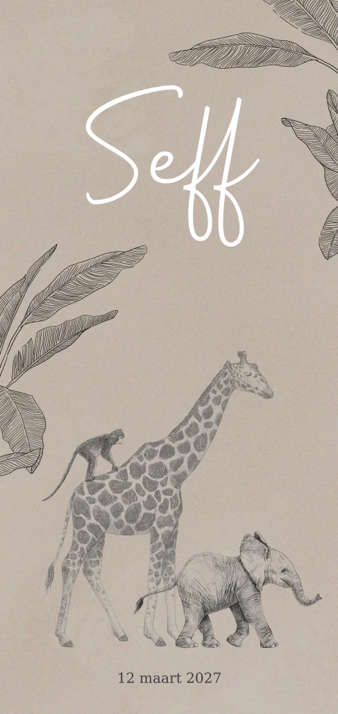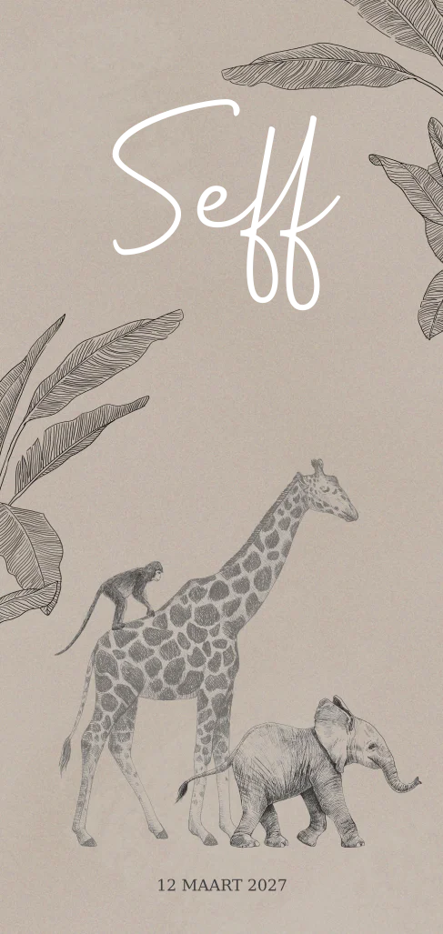 Geboortekaartje jongen jungle thema. Dit is een stoer langwerpig staand formaat van 10x21 cm en de naam staat in letters van goudfolie foliedruk . (22646) Geboortekaartje Seff. Wil je deze kaart maar dan dubbel zodat je meer ruimte hebt? Dat kan! Neem daarvoor contact met ons op.