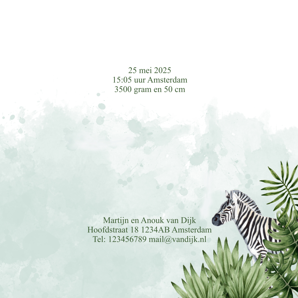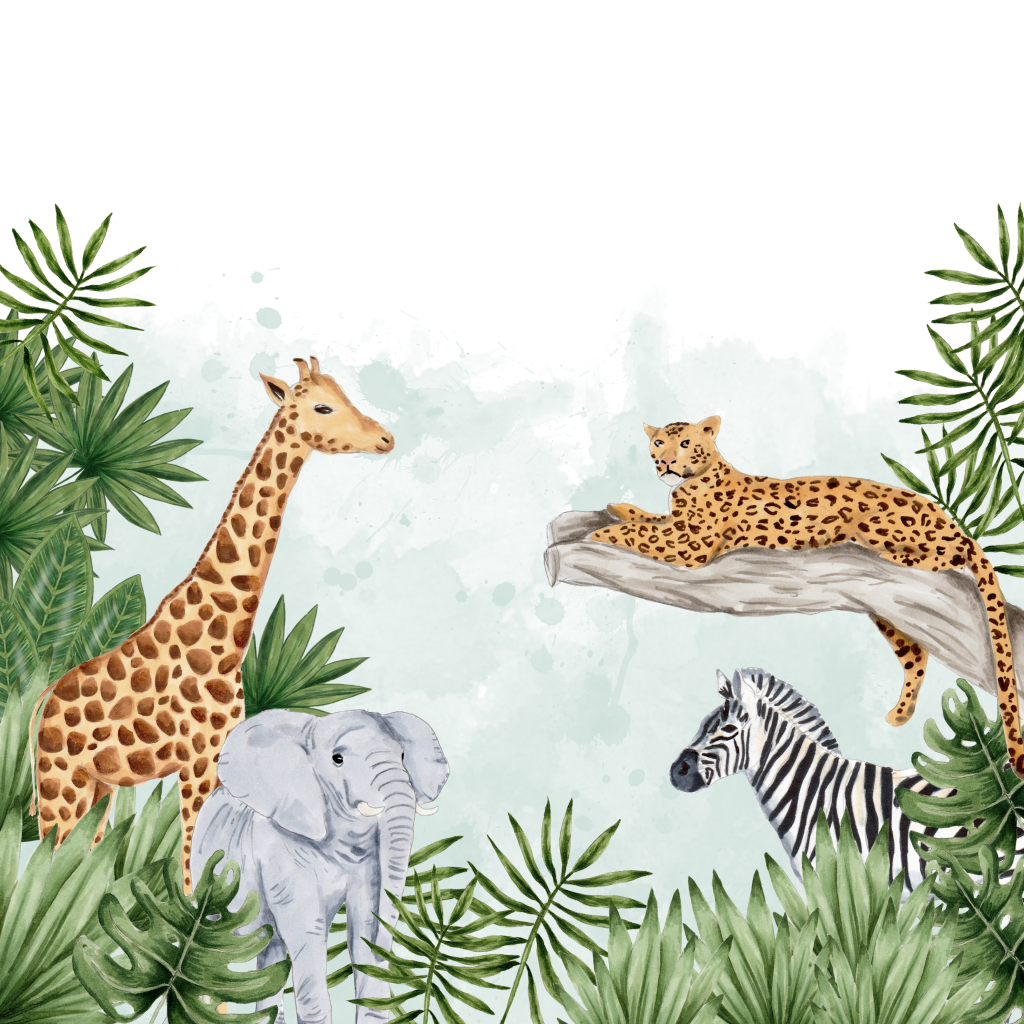 Een hip geboortekaartje voor een tweeling, met jungle illustratie, dieren en goudfolie. Pas zelf de teksten aan. (21435)