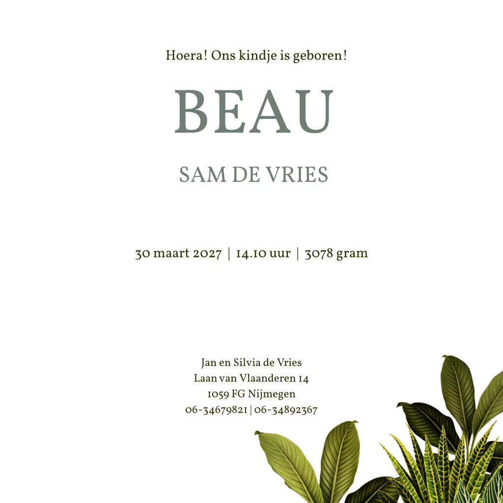 Jungle geboortekaartje met naam in goudfolie. De kaart is chic, hip, stoer en lief tegelijk. (8582)
