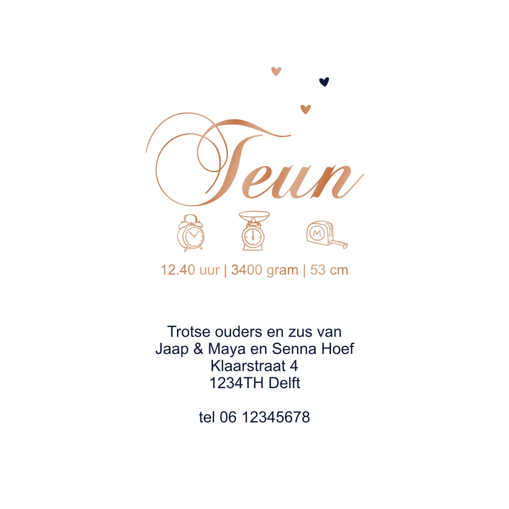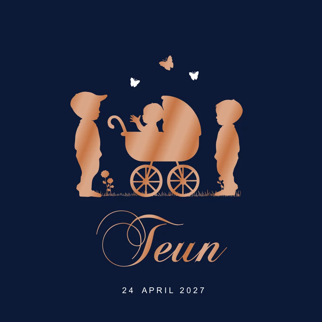 Kinderwagen geboortekaartje drie broers met hoogglans koper lak