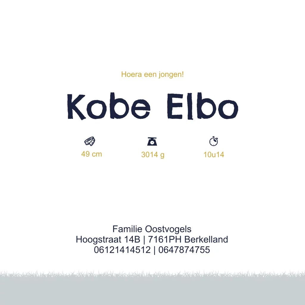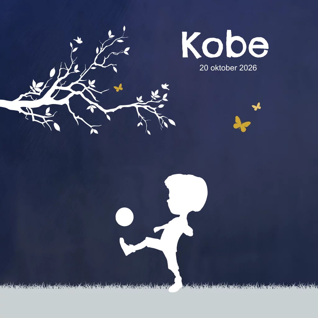 Dit getekende geboortekaartje heeft een donkere achtergrond en is voorzien van een silhouet met voetbal jongen en naam in zilverfolie. (9988)