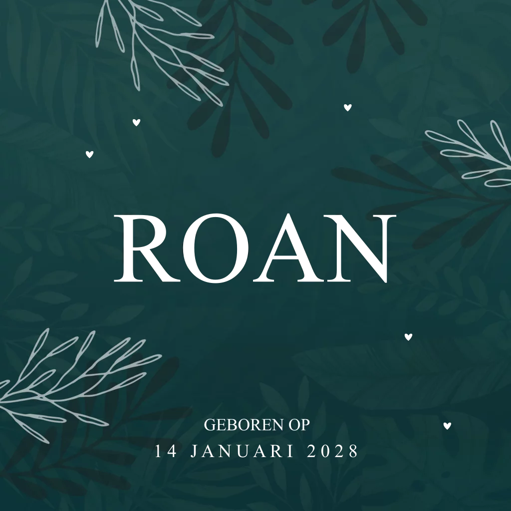 Stoer geboortekaartje jongen met takjes groene bladeren en de naam in goudfolie. (20461)