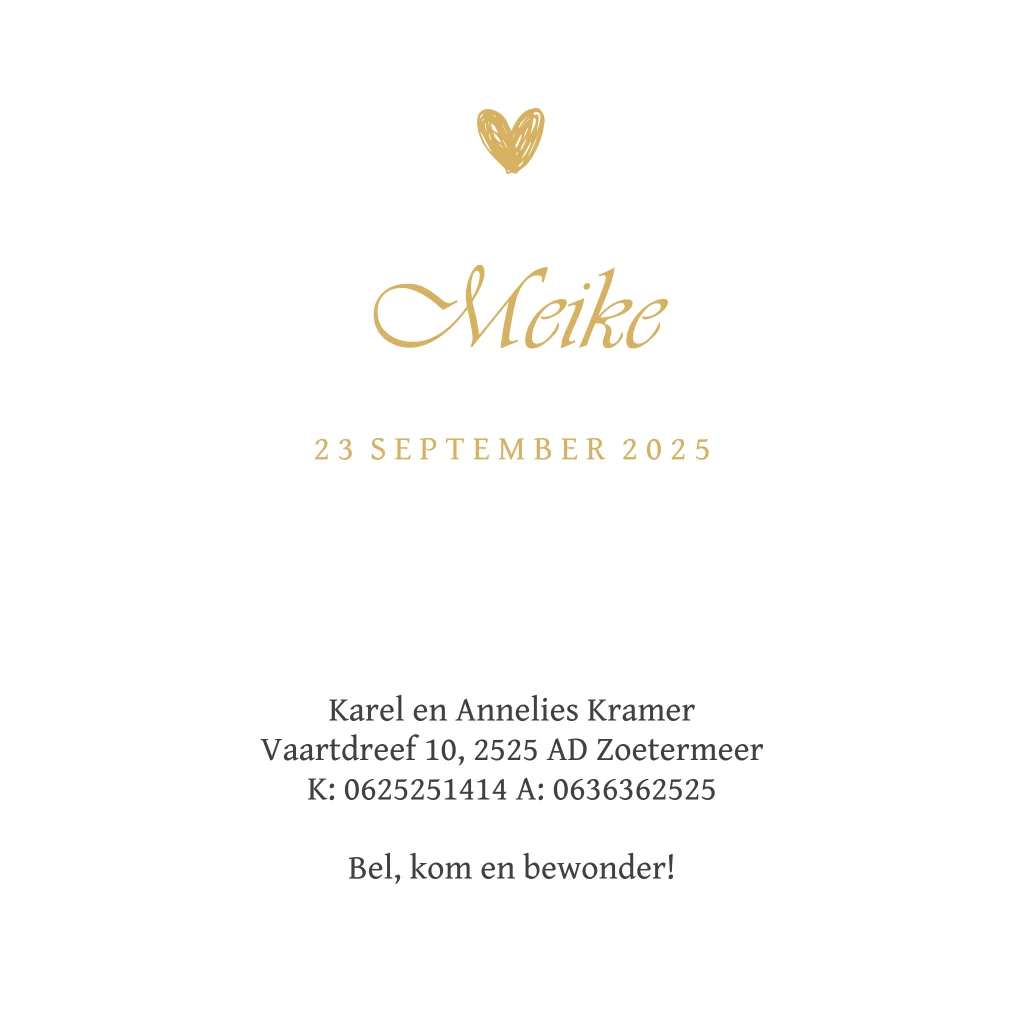 Maak deze lieve geboortekaart voor jullie kleine wondertje met schattige hartjes. Door de verschillende hartjes in goudfolie en de verloop in de foto een extra luxe uitstraling. (10006)