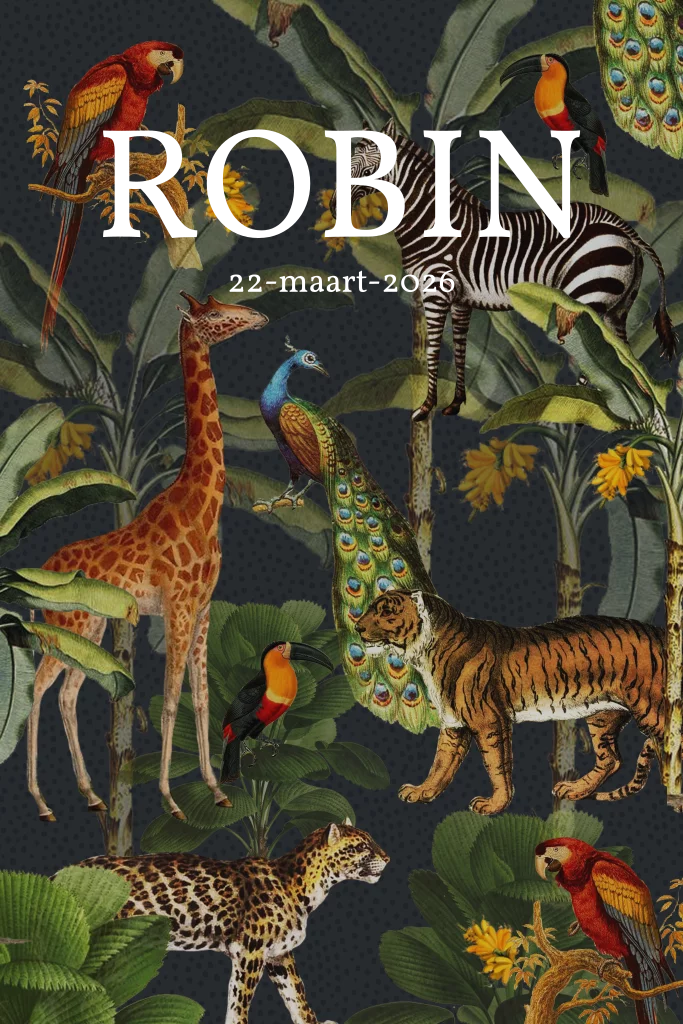 Geboortekaartje bohemian jungle met echte goudfolie. Alle jungle dieren en planten zijn vertegenwoordigd op de dit geboortekaartje. (8583)