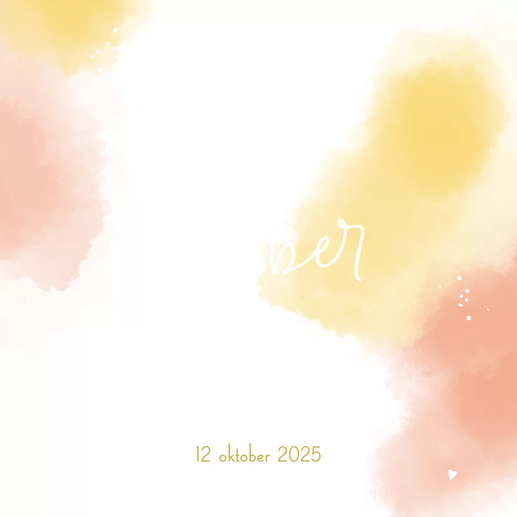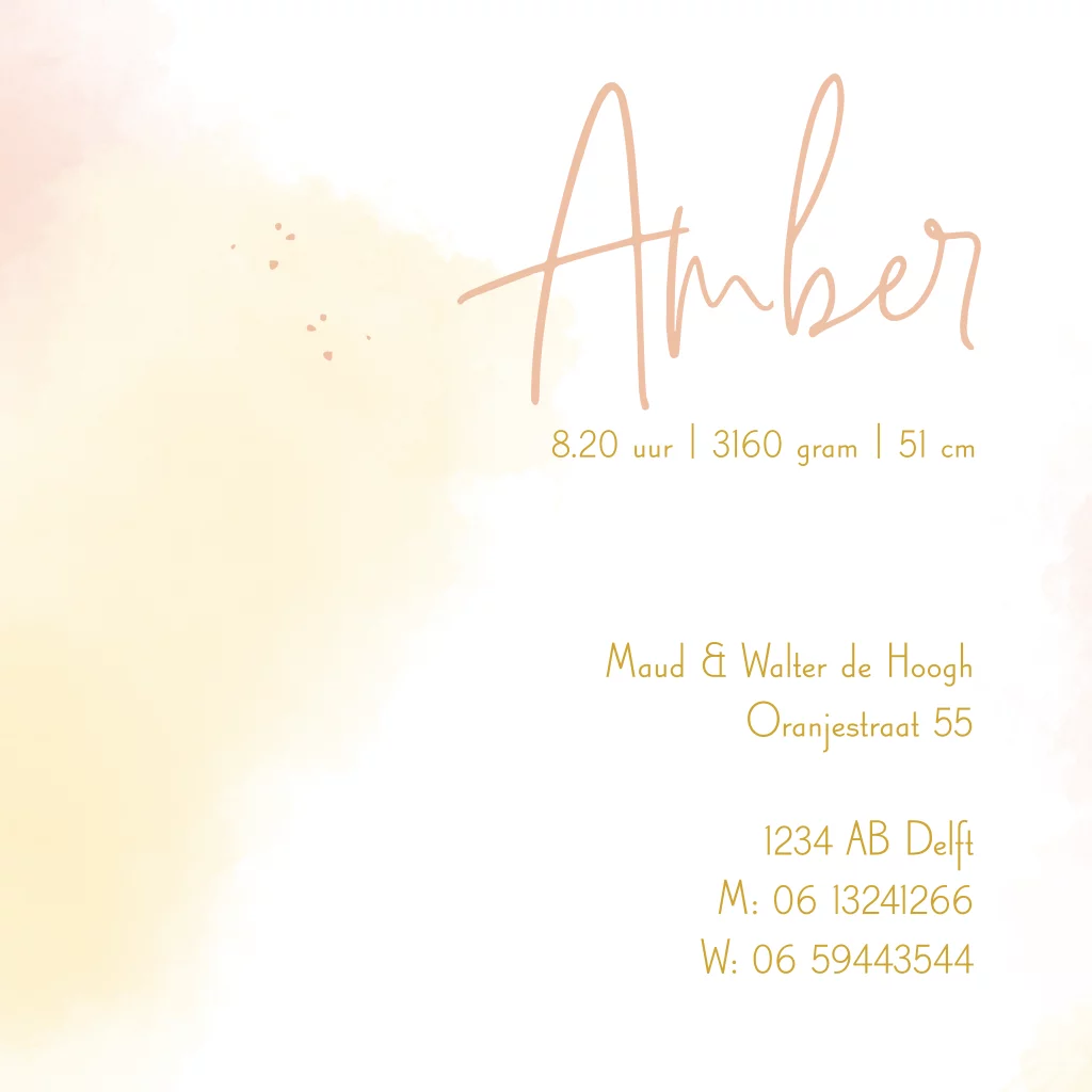 Een mooi typografisch geboortekaartje voor een meisje met aquarel in roze en oker met foliedruk in de naam en hartjes. (22669)