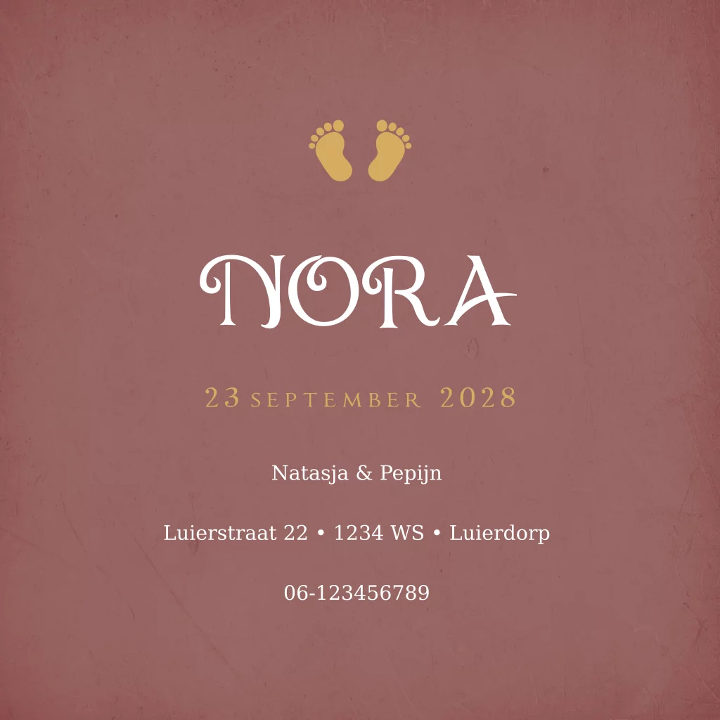 Geboortekaartje voor een meisje met prachtige gouden voetjes. (20663). Geboortekaartje Nora.