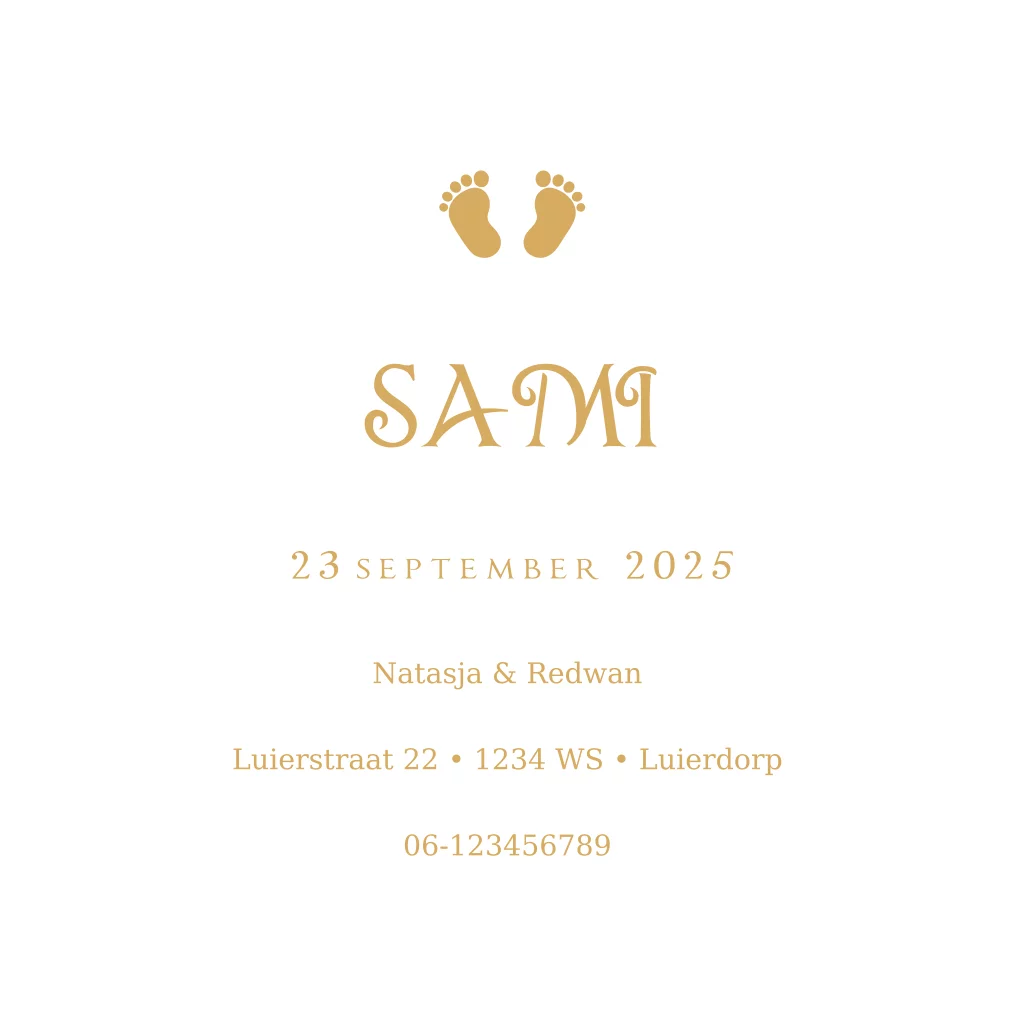 Neutraal geboortekaartje Sami met prachtige gouden voetjes. (20663)