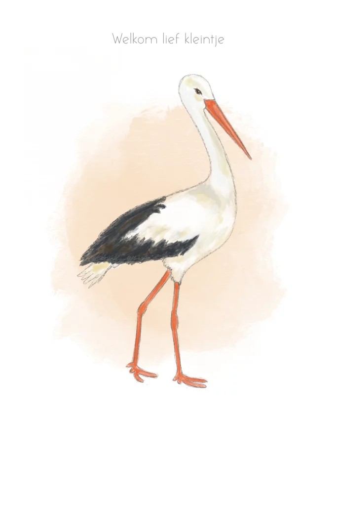 Een origineel geboortekaartje voor een meisje met een mooie getekende ooievaar, met een zalmkleurige aquarel achtergrond. De naam is gedrukt in rose foliedruk. (22276)