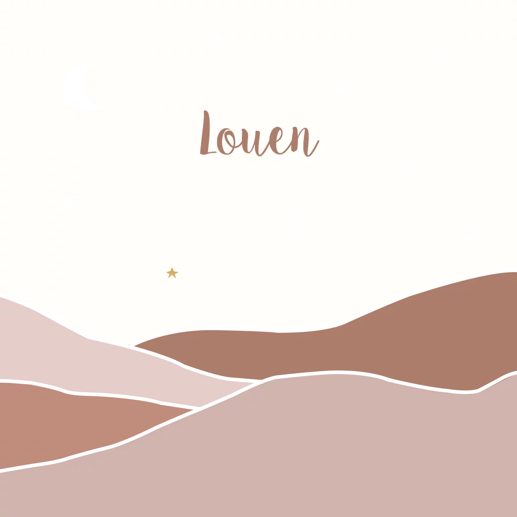 Een bergen geboortekaartje met sterren, maan en bergen in goudfolie. Pas zelf de teksten aan en eventueel de foliekleur. (22167)