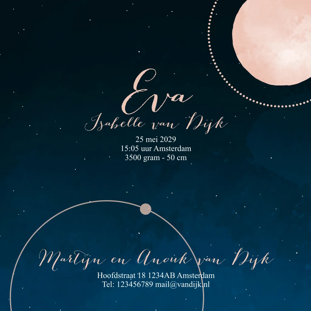 Een mooi en hip geboortekaartje met sterrenhemel, maan en planeten in rosé goudfolie. Let op: het kan zijn dat de foliedruk lijntjes aan de buitenkant niet helemaal tot de rand lopen, dit is helaas niet altijd doorlopend te krijgen met foliedruk. (22063)