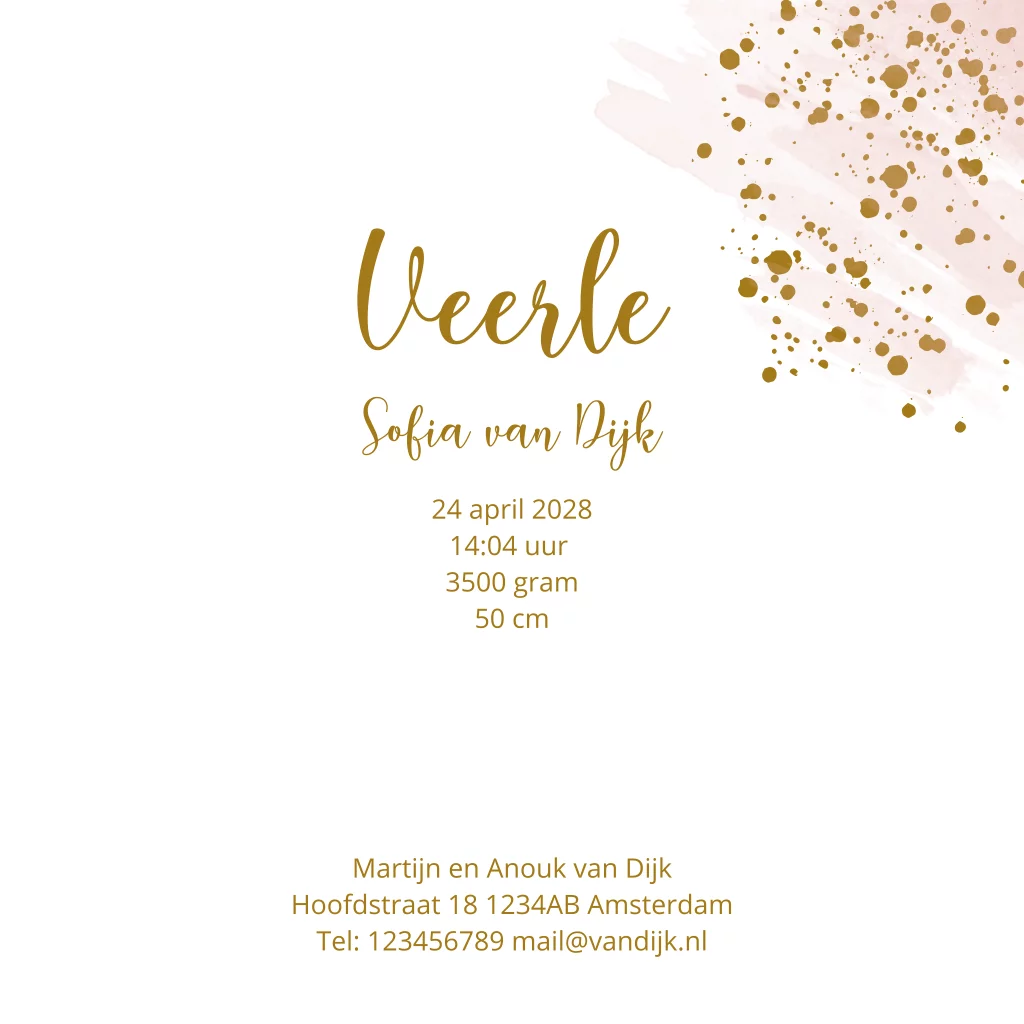 Een lief en hip geboortekaartje met goudfolie, waterverf en hartje. Pas zelf de teksten aan en eventueel de kleur van het folie en achtergrondkleur. (22043)