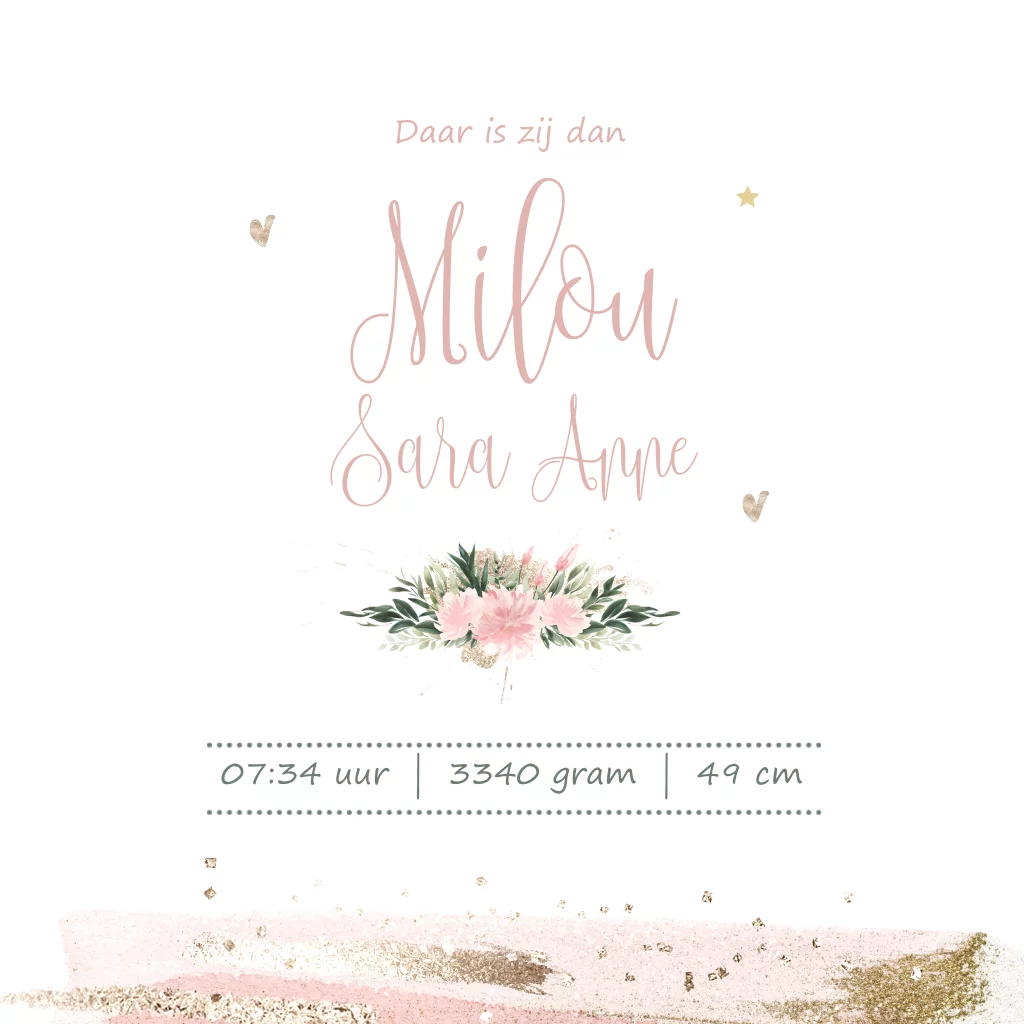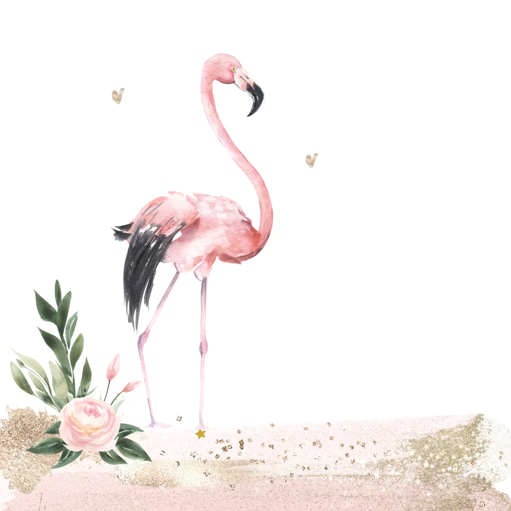 Mooi geboortekaartje met flamingo, waterverf en rosegoud foliedruk