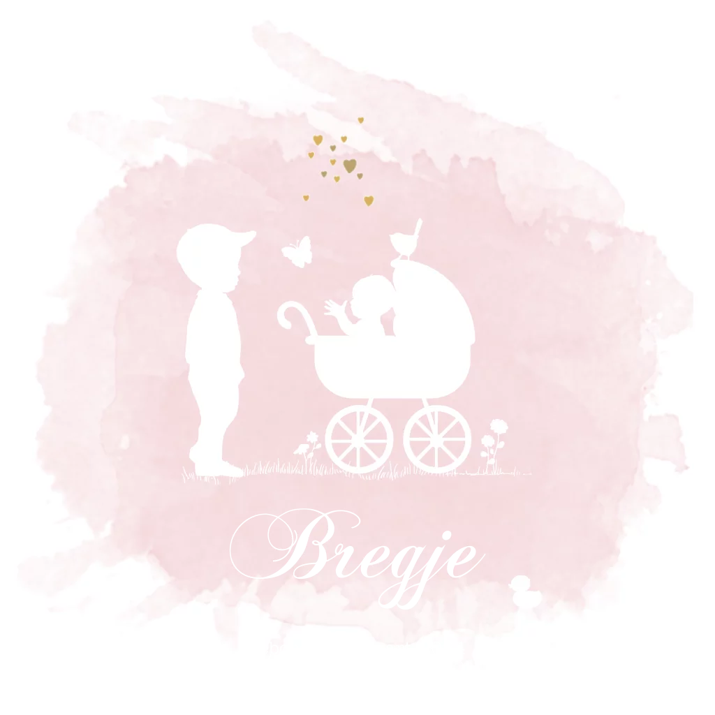 Profiel geboortekaartje grote broer tweede kindje zusje. Met kinderwagen en goudfolie druk. (4997)