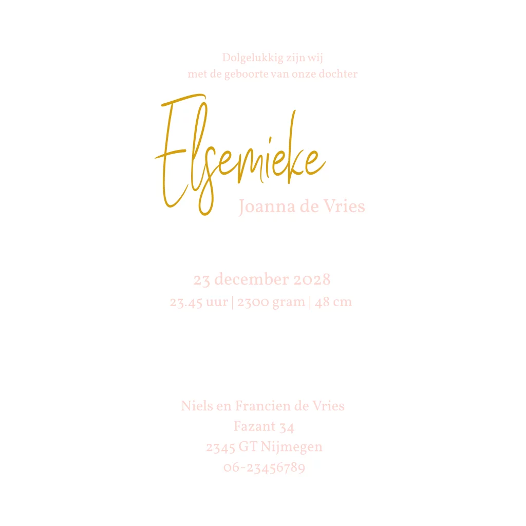 Bij dit kaartje kun je foliedruk aan alle zijdes gebruiken. Je kunt dit kaartje ook bestellen met alleen foliedruk op de voorkant waardoor de kosten per kaart lager zijn. Vragen hierover? Neem gerust contact met ons op.