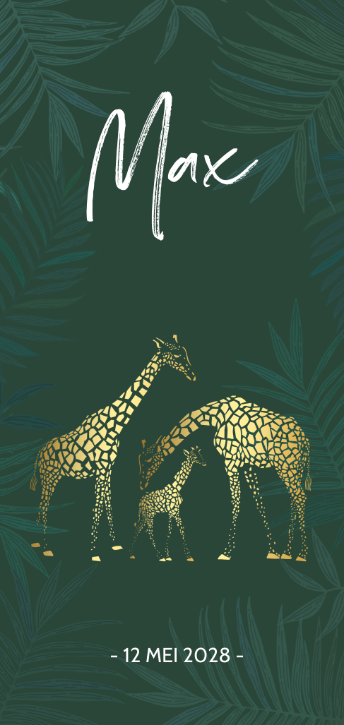 Geboortekaart jongen giraffen met takjes groen goudfolie. (21063)