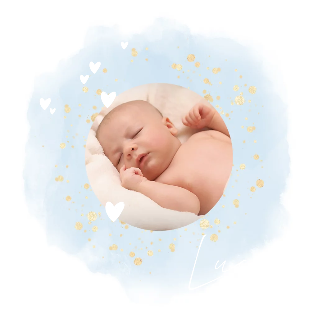 Jongens geboortekaartje met babyfoto, aquarel in blauw en goudfolie hartjes. Pas zelf de teksten aan en vervang de foto. (21025)