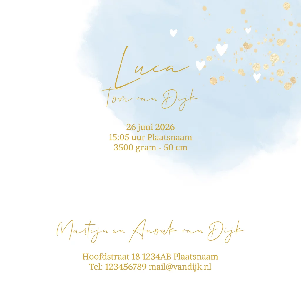 Jongens geboortekaartje foto aquarel hartjes goudfolie