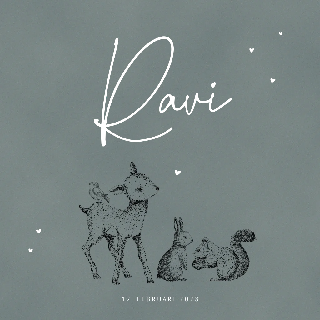 Geboortekaartje jongen donkergroen met goudfolie naam en hartjes en getekende bosdieren. (22650) Geboortekaartje Ravi