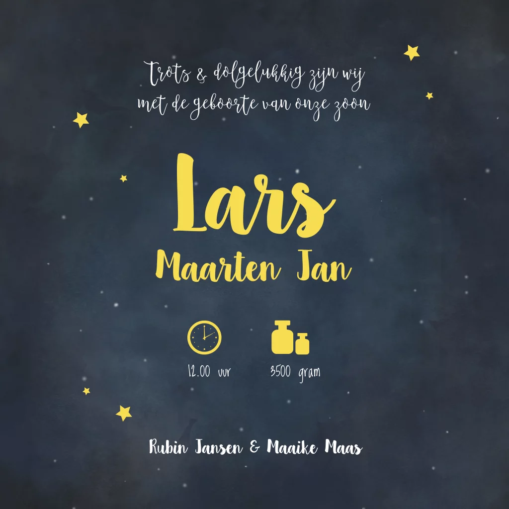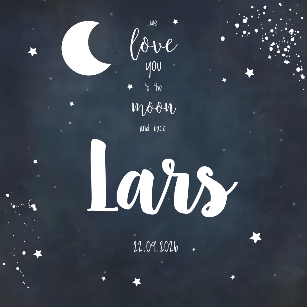 Love you to the moon and back. Een stoer maar ook lief geboortekaartje jongen. De details worden aangebracht met goudfolie. Kies je kleur, lettertype en plaats je teksten. (20589)