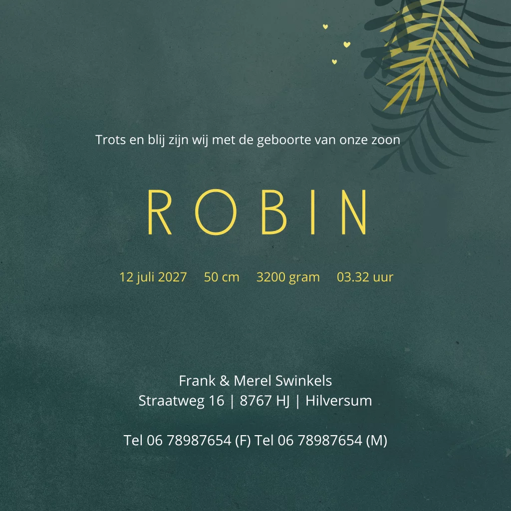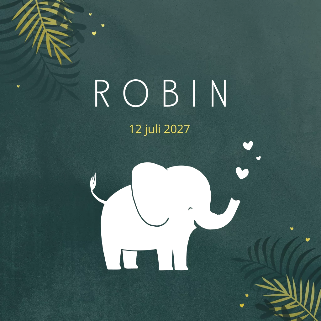 Geboortekaartje jongen met klein olifantje en bladeren. De naam op de voorkant en de olifant staan in extra glimmende goudfolie gedrukt. (21865)