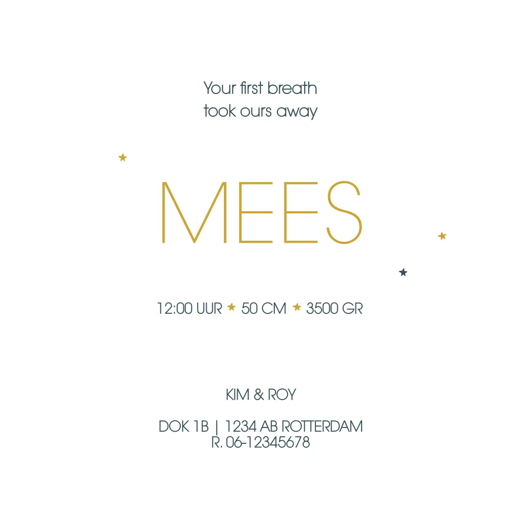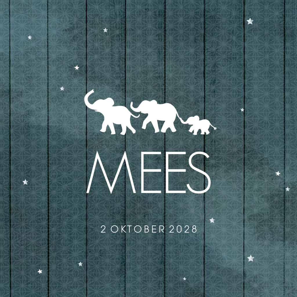 Geboortekaartje Mees voor een jongen met houtlook patron en goudfolie 3 olifantjes op rij. (21721)