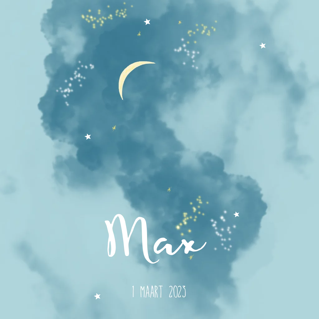 Een hip geboortekaartje voor een jongen met wolken, maan en sterren en goudfolie. (20735)