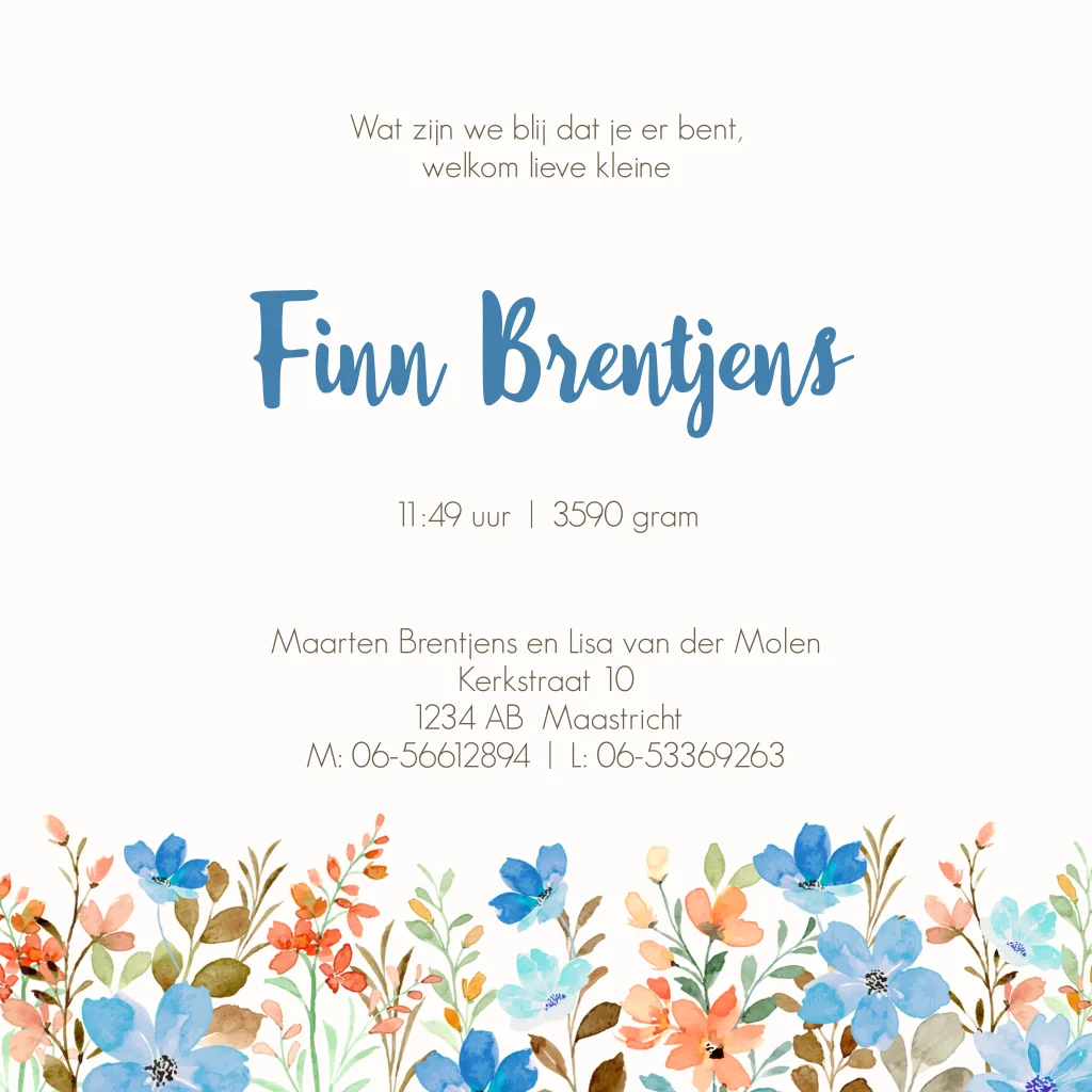 Geboortekaartje jongen met een lief olifantje met verschillende blauw gekleurde bloemen en confetti in foliedruk. (22435)