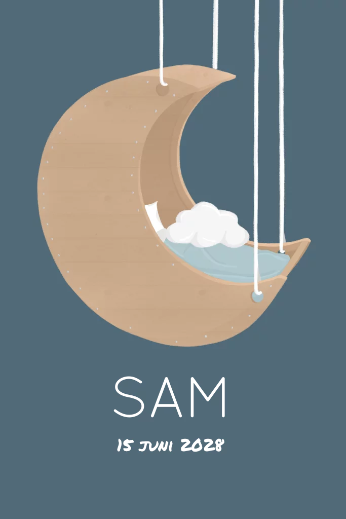 Geboortekaartje voor een jongen met maanwieg en zilverfolie bedrukking
