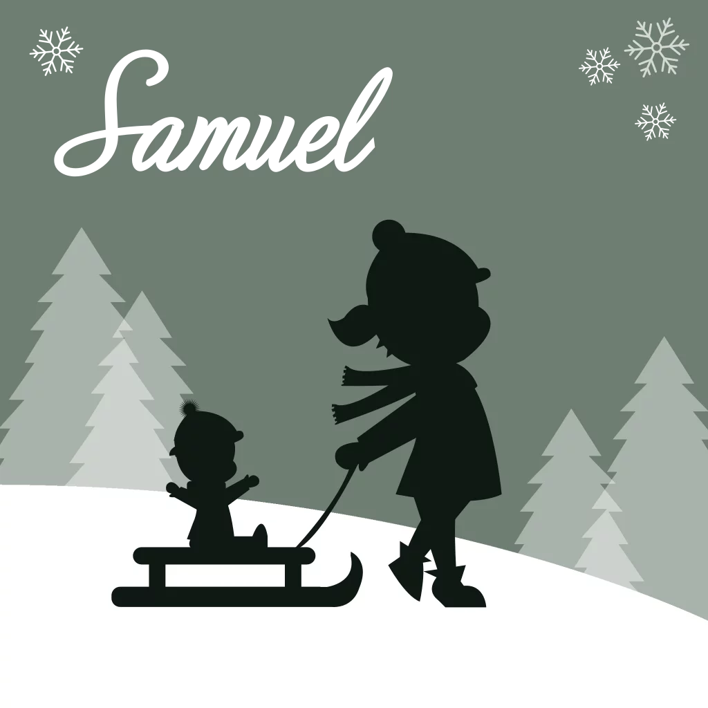 Winter geboortekaartje 2e kindje met een silhouette van een grote zus die haar broertje op een sleetje voortrekt. Leuk voor een kindje dat in de winter wordt geboren. (20508)