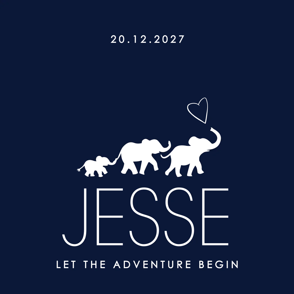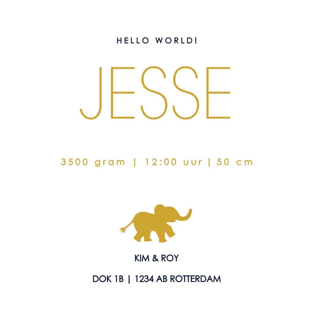 Geboortekaartje jongen met familie olifant in goudfolie. 3 olifantjes op een rij. Ook de naam en geboortedatum is met goudfolie. Bewerk de kaart in de editor en kies je favoriete lettertype, kleur folie en achtergrondkleur. (10172) Dit kan ook gebruikt worden voor een derde kindje.