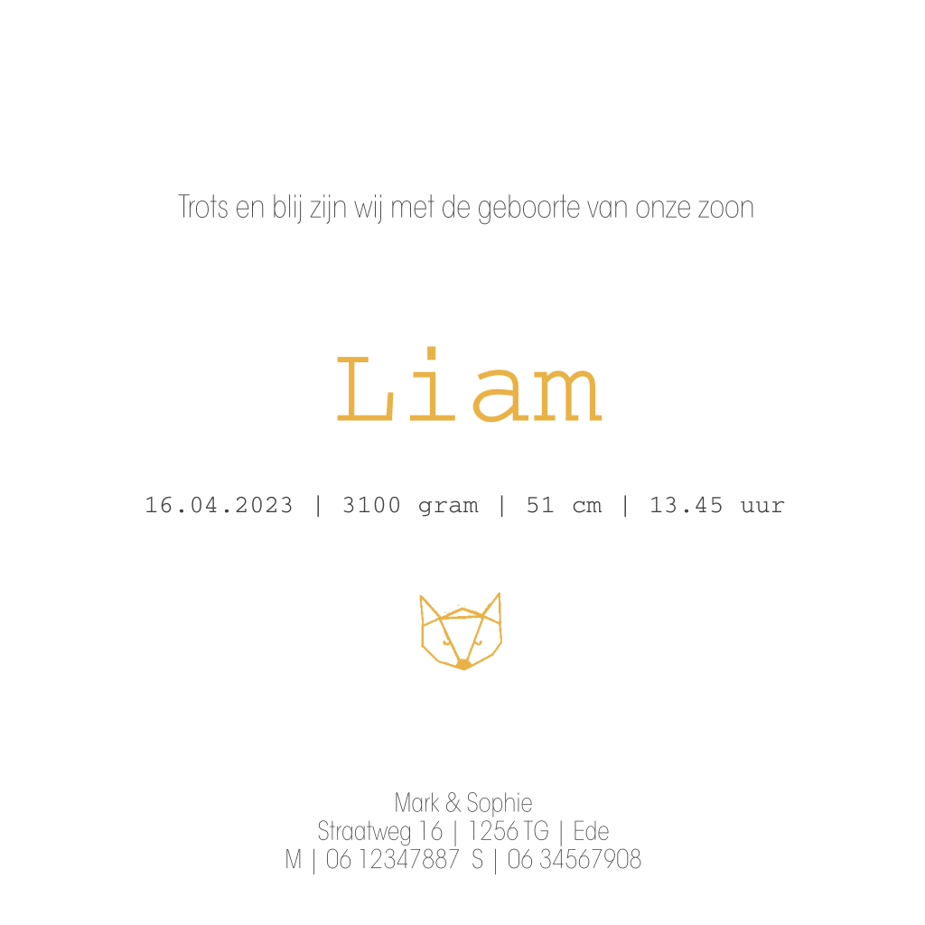 Hip origami geboortekaartje vosje voor een jongen in goudfolie. (999999)