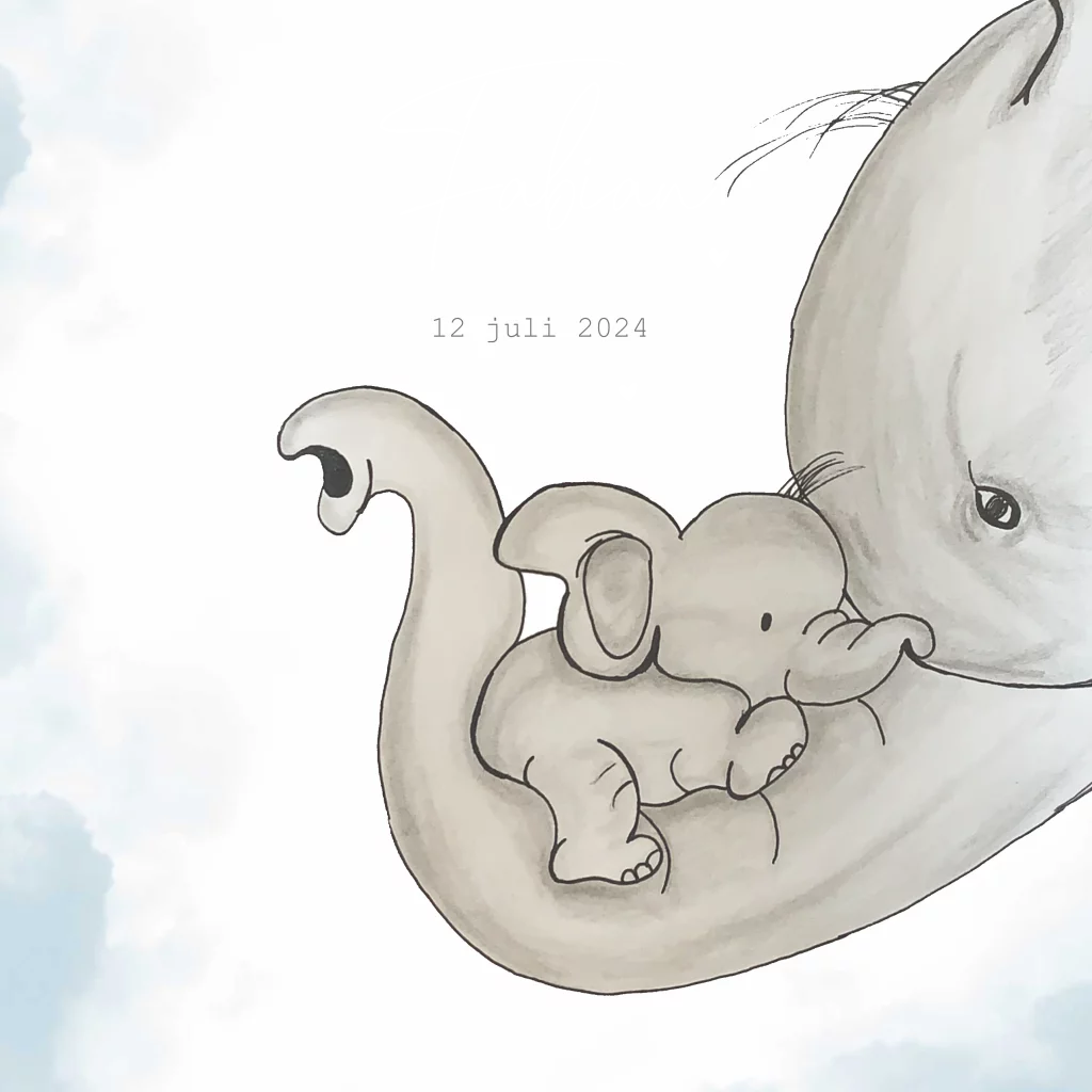 Lief getekend geboortekaartje jongen baby olifant slurf moeder