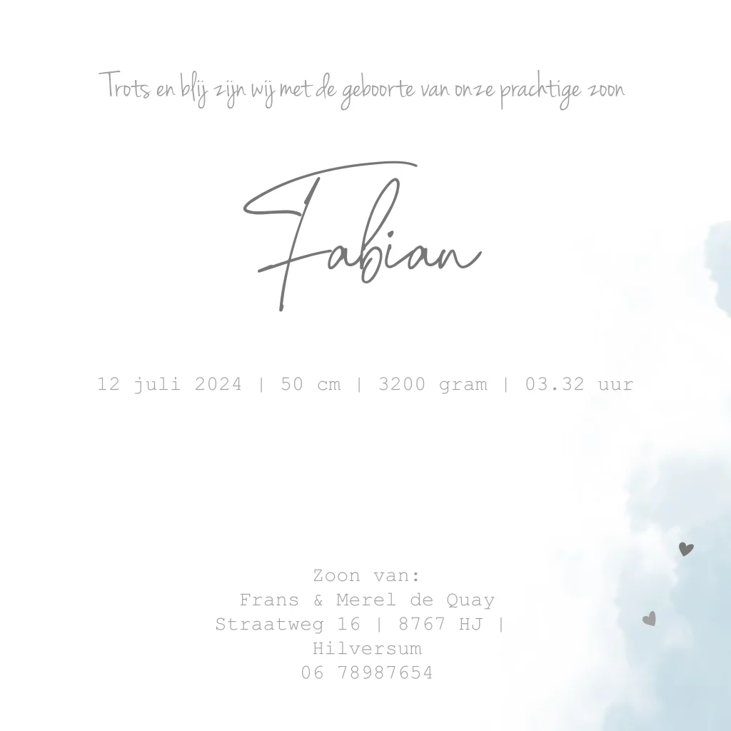 Lief getekend geboortekaartje met een baby olifantje liggend op de slurf van moeder olifant. Met hartjes en zilverfolie druk. Blauwe aquarel. (999999)