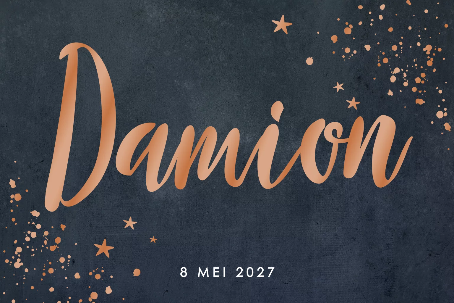 Een stoer geboortekaartje voor een jongen met spetters, sterren en de naam in hoogglans koper lak. Het geeft het kaartje een luxe uitstraling. Heel mooi op de stoere achtergrond in donkerblauw. (20587)