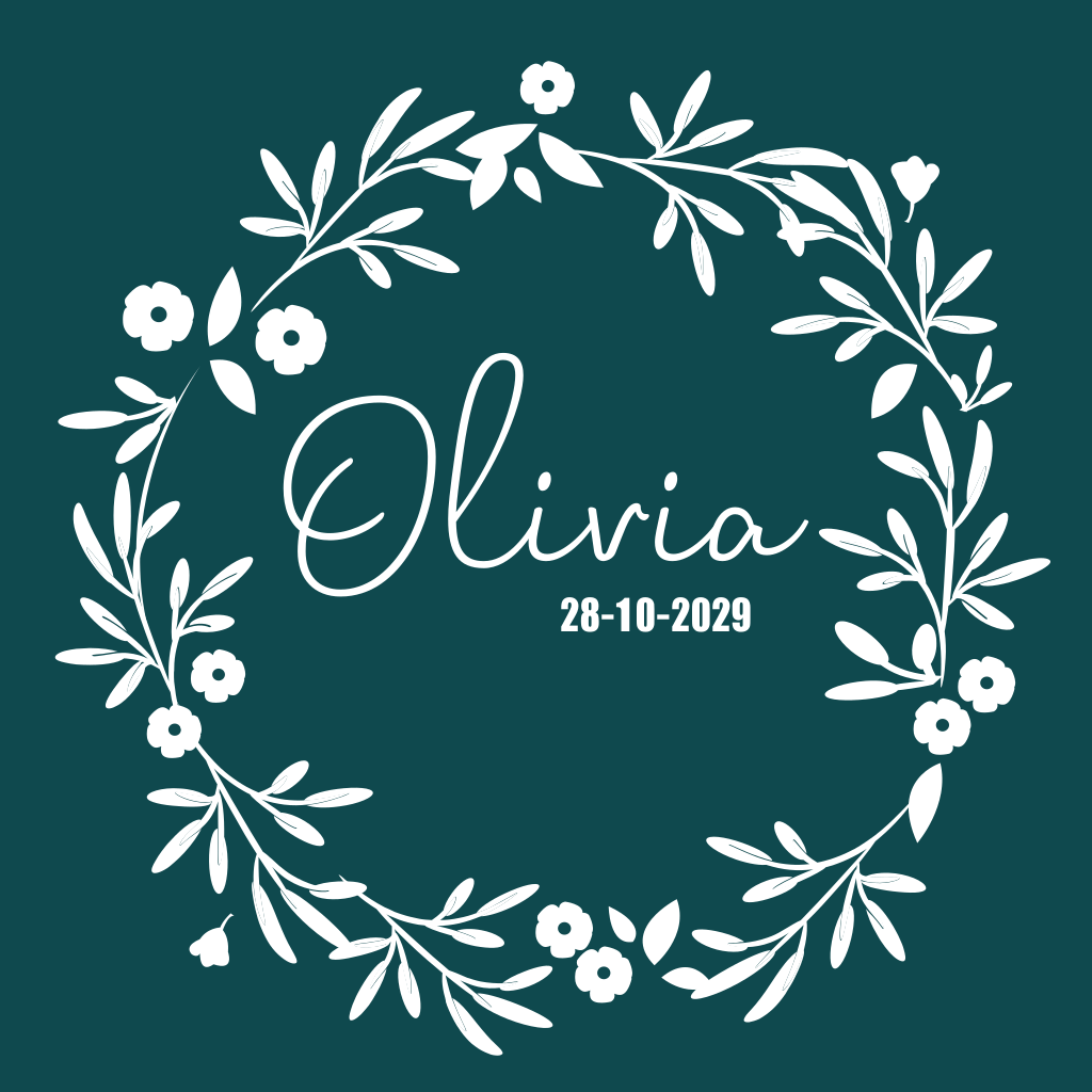 Chic geboortekaartje met een bloemenkrans in rosefolie op een donkergroene achtergrond. De achtergrondkleuren zijn naar smaak aan te passen. (22266)