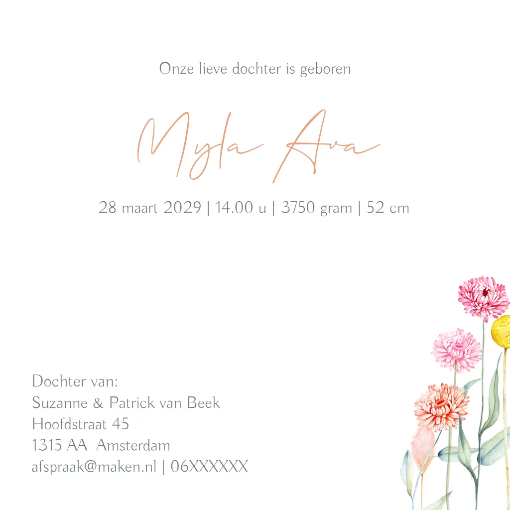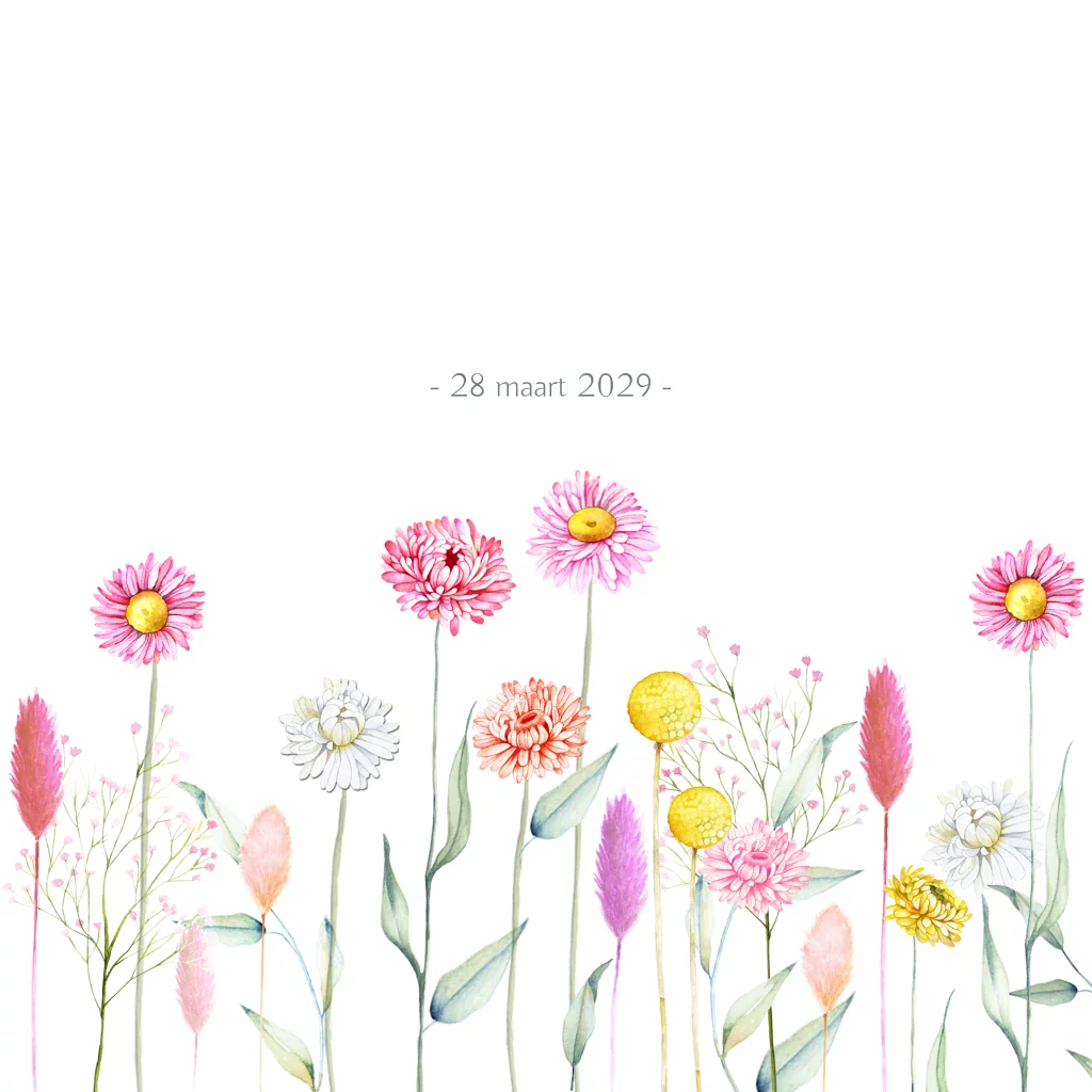 Geboortekaartje meisje met veldbloemen en chrysanten in vele vrolijke kleuren . De chrysant is de geboortebloem voor de maand november. (21732)
