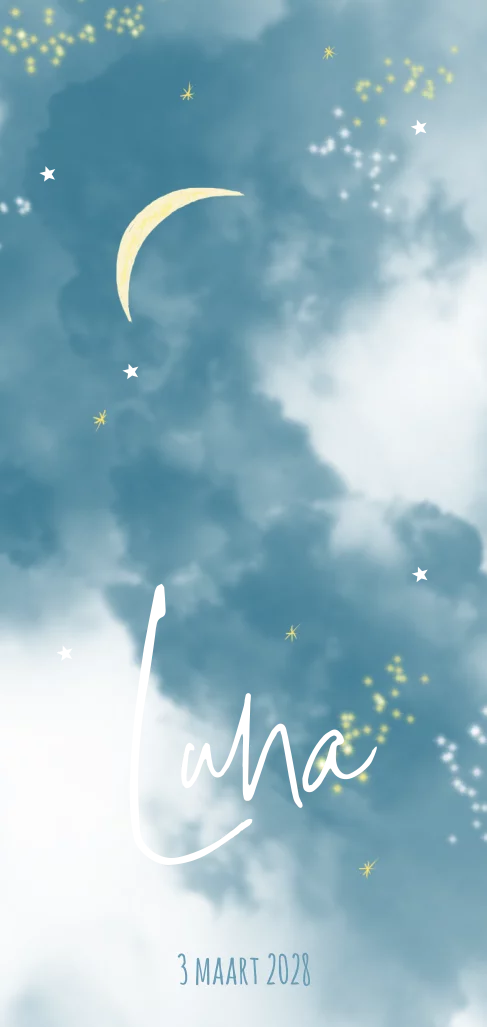 Een hip geboortekaartje voor een meisje met maan en sterren en goudfolie in de naam en sterren. (20734)