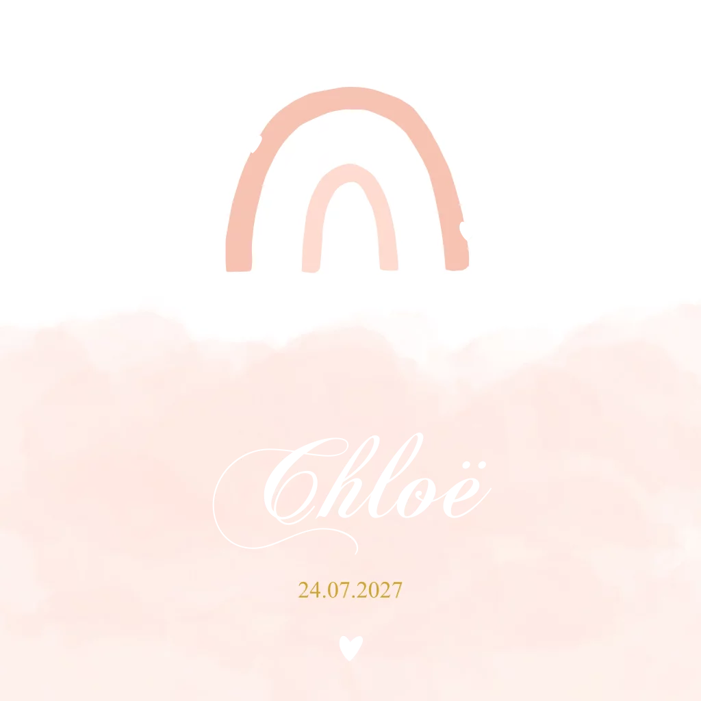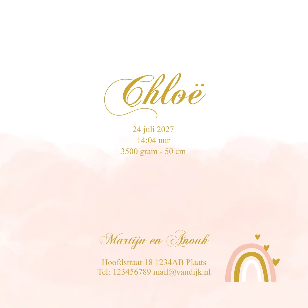 Een lief geboortekaartje met een regenboog, hartjes, wolken en goudfolie. Een aantal kleuren zijn aanpasbaar. Pas ook de teksten aan. (21210)