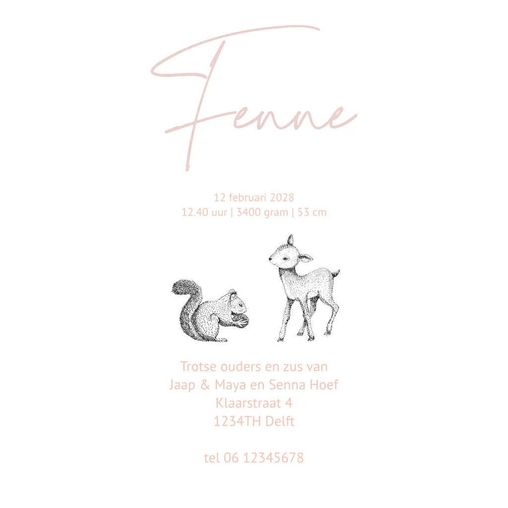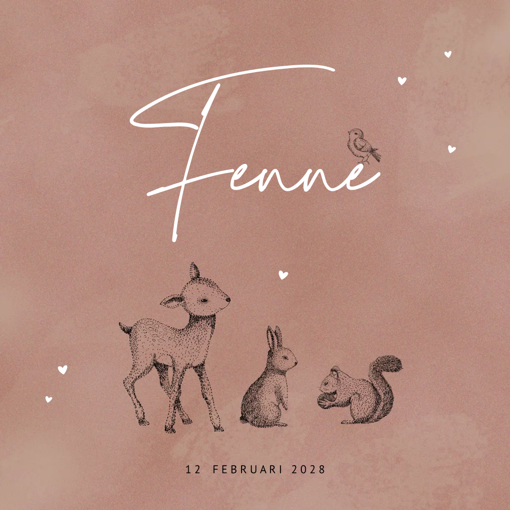 Geboortekaartje meisje in een warme kleur roestbruin met de naam in glimmende letters roségoud foliedruk met leuk getekendde bosdieren zoals een hert, eekhoorn en konijn. (22648) Geboortekaartje Fenne.